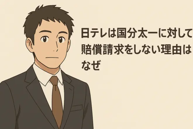 日テレが国分太一に賠償請求をしない理由を伝えるアニメ風イラスト|スーツ姿の男性と話題のテロップ入り見出し画像
